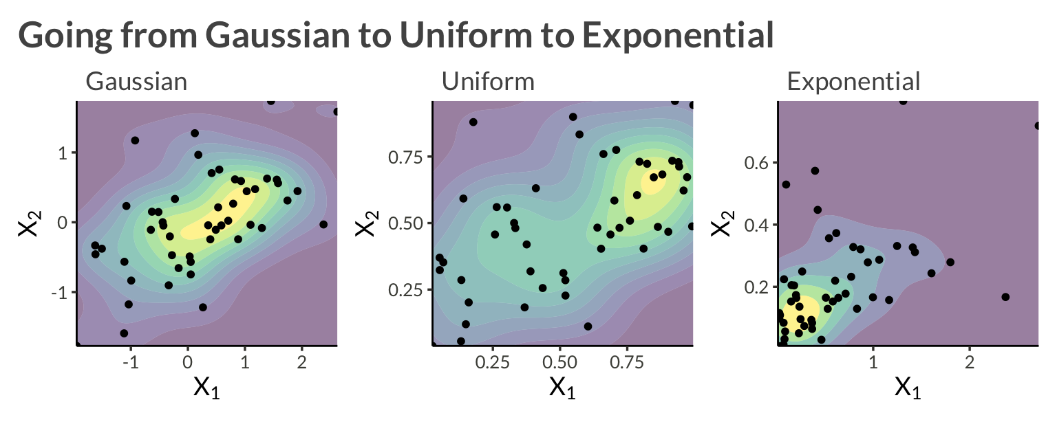 Let’s consider an example with two variables, \(X_1\) and \(X_2\). We will model each asset’s marginal distribution as exponential, and apply a bivariate Gaussian copula to model their dependence. Alltogether this can be written \[ \log h(\mathbf{X}) = \log f_\Sigma(z_1, z_2 \vert \Sigma) - \log \phi(z_1, z_2) + \sum_{i=1}^2 f_{\mathrm{Exp}}(X_i \vert \lambda_i) \]