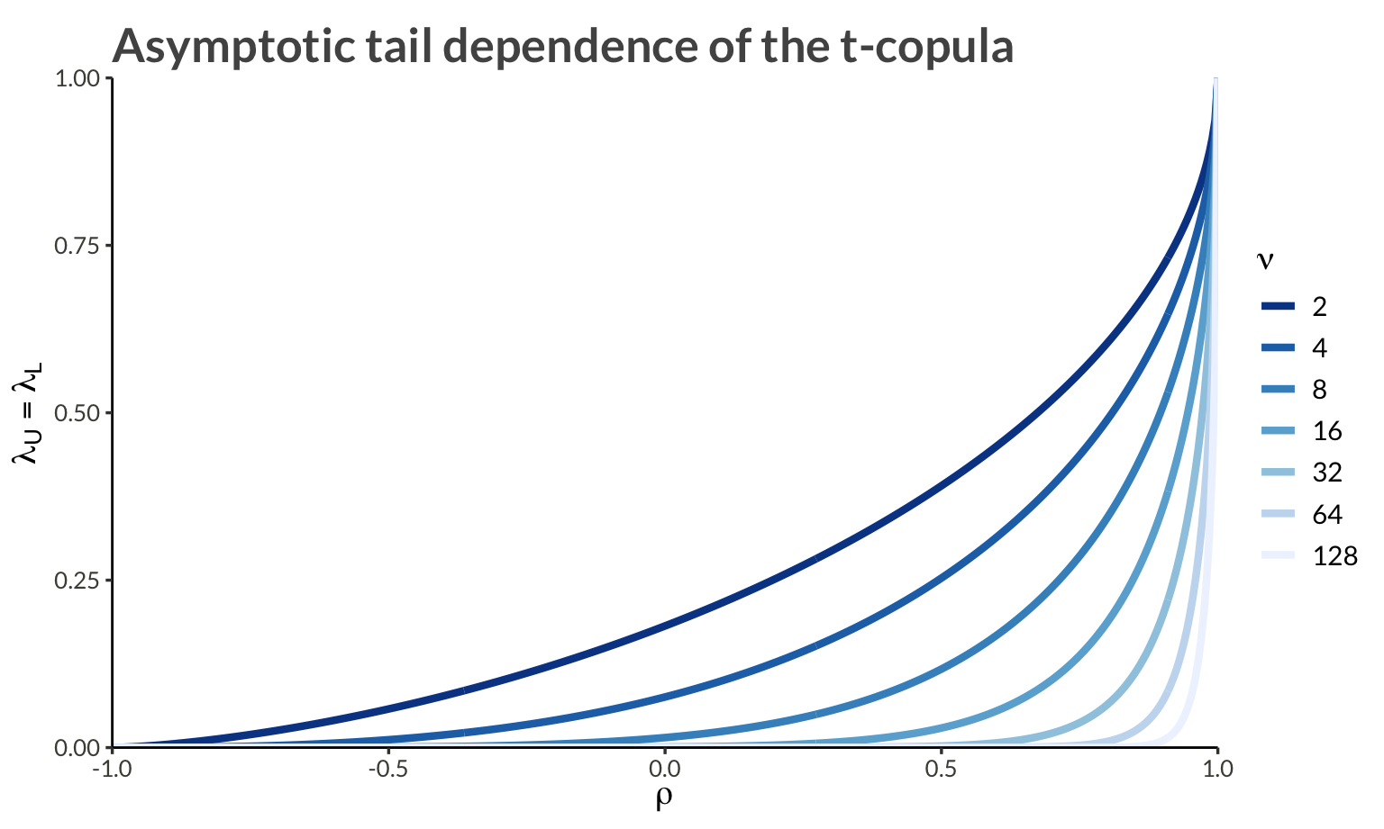 This symmetry (\(\lambda_U = \lambda_L\)) means the t-copula treats both tails equally.
