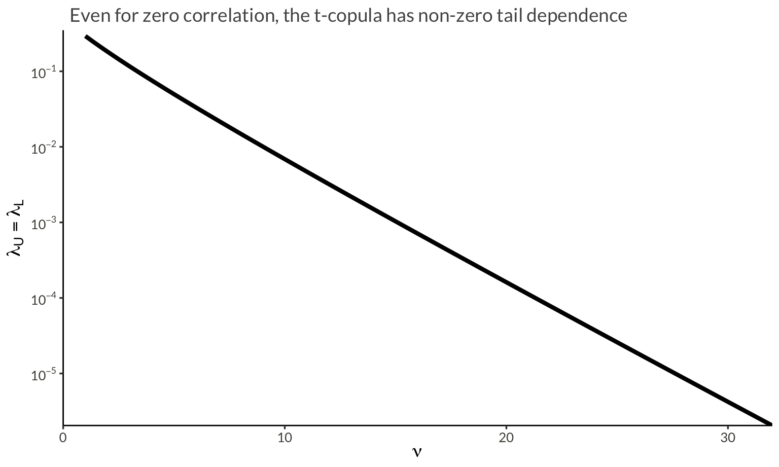 subtitle = "Even for zero correlation, the t-copula has non-zero tail dependence"