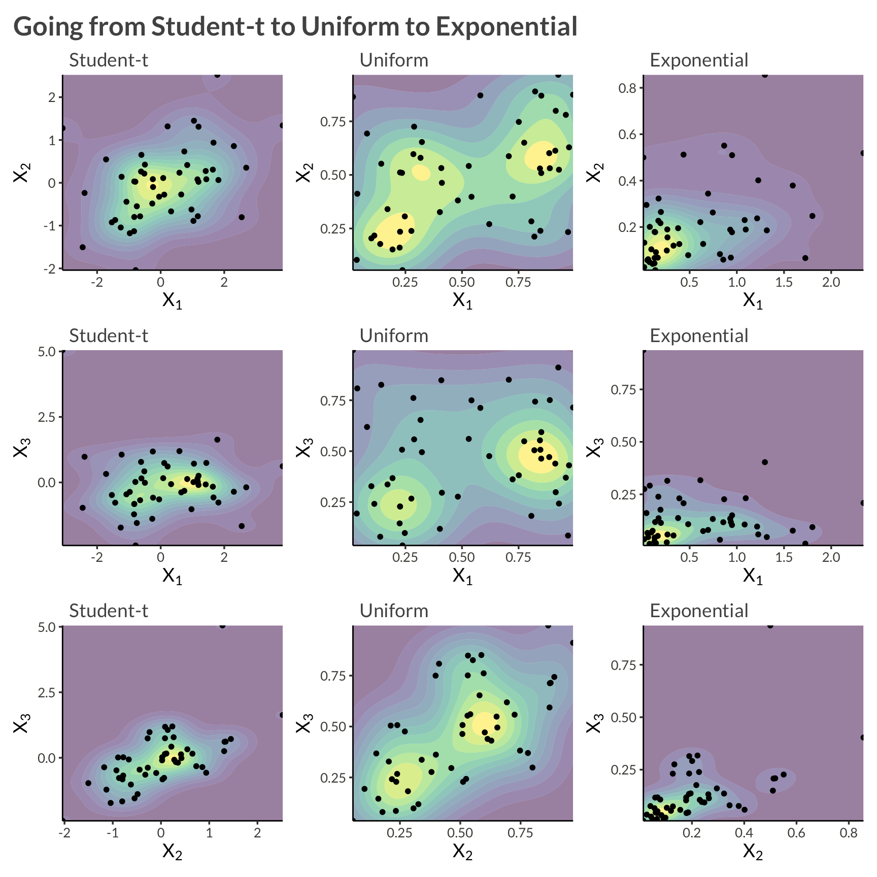 Now that we have the intuition, let’s look at the formal definition. Let \(\mathbf X = (X_1, \dots, X_D)\) be a multivariate random variable with marginal distribution functions \(F_i\) and dependence according to the t-copula. Their joint distribution function and density can be written: \[ \begin{aligned} H(\mathbf{X}) &= t_{\nu,\Sigma}\left(t_\nu^{-1}(F_1(X_1)), \dots, t_\nu^{-1}(F_D(X_D))\right) \\ h(\mathbf{X}) &= c\left(F_1(X_1), \dots, F_D(X_D)\right)\prod_{i=1}^D f_i(X_i) \end{aligned} \]